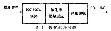 高浓度的有机废气在外力的作用下进入氧化床中,通过金属铂的催化作用,被燃烧分解为H2O与CO2,废气通过这一操作得到净化。这一燃烧过程的特征为低温、快速以及无焰,并产生较大的热量,人们可以将活性炭再次回用到有机废气的脱附与燃烧氧化中,从而降低能源消耗。具体的反应过程如图1所示。